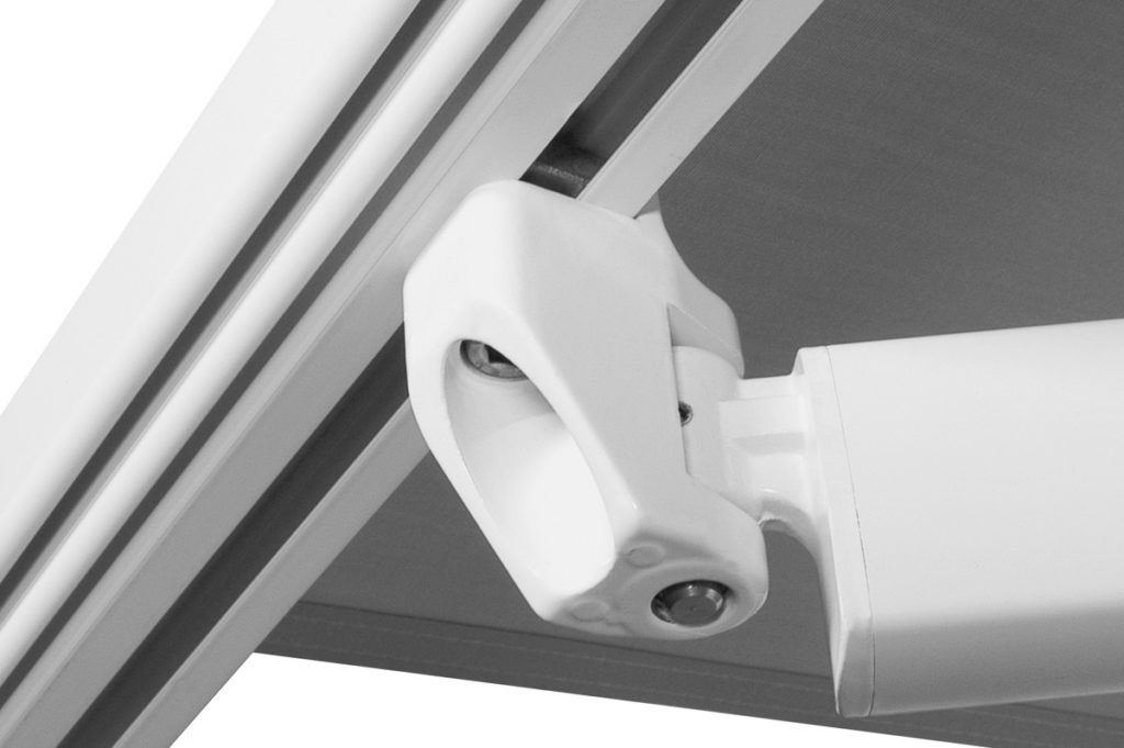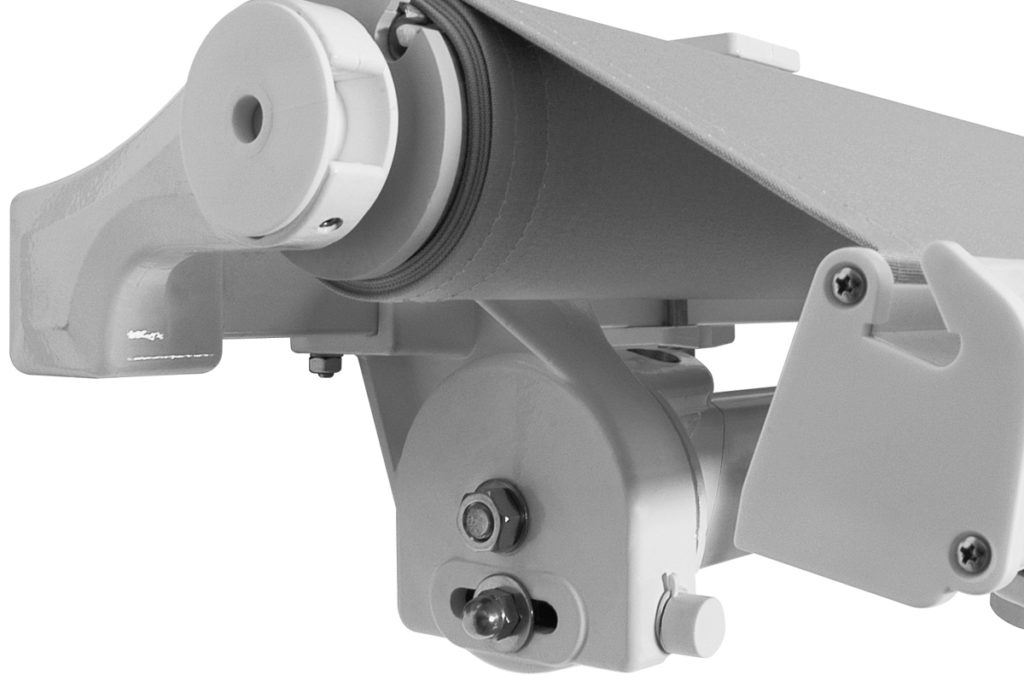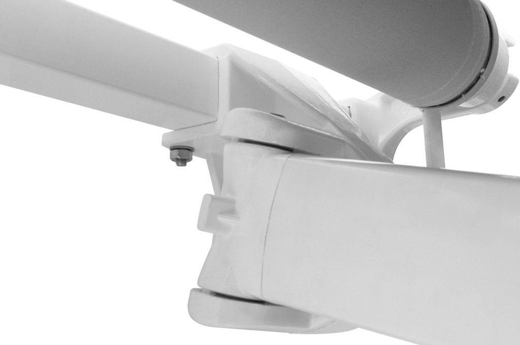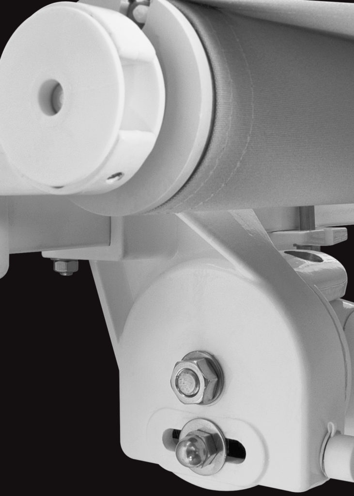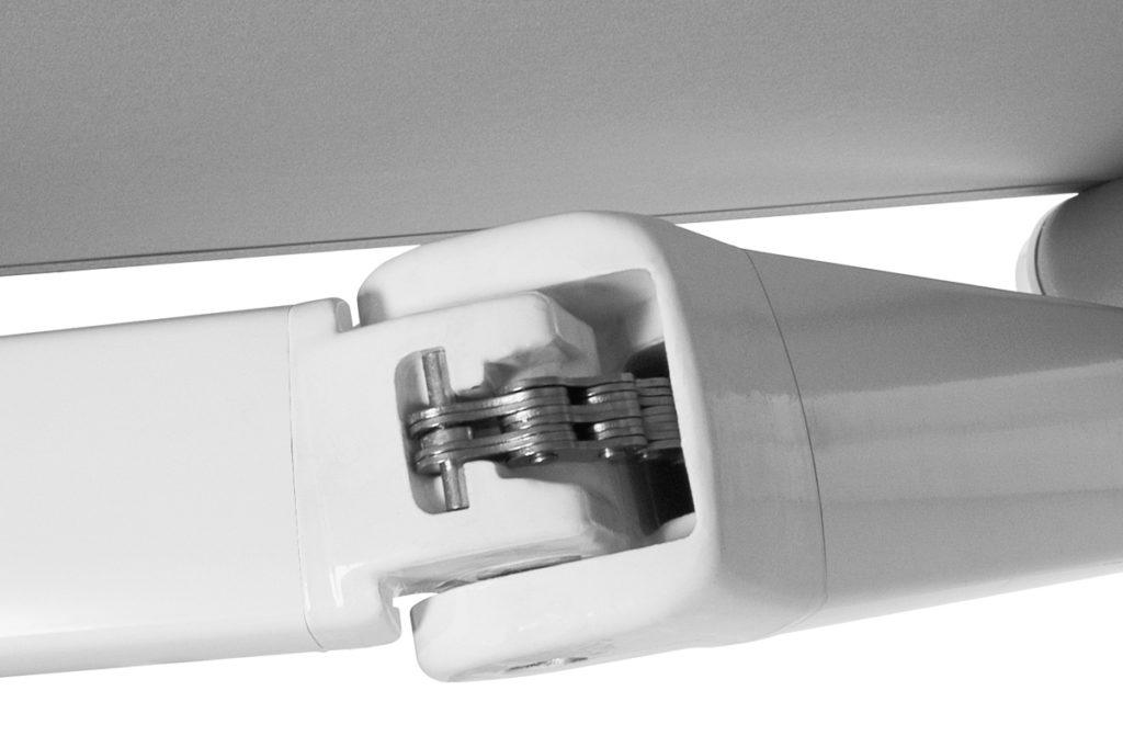 Gelenkarm-Markise auf 40×40 mm Vierkant-Tragrohr mit seitlichem oder Zwischen-Armträger. Maximalgröße je einziges Modul: Breite 600 cm und Ausladung 400 cm.