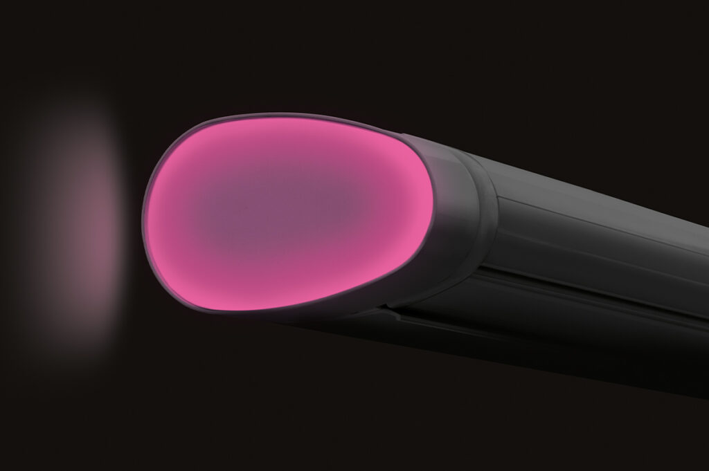 Shows a side header in opaque glass that can light up in the colour you prefer, adjusting its intensity. The header is connected to a transformer with a control box and you can control it using a remote controller or using a special