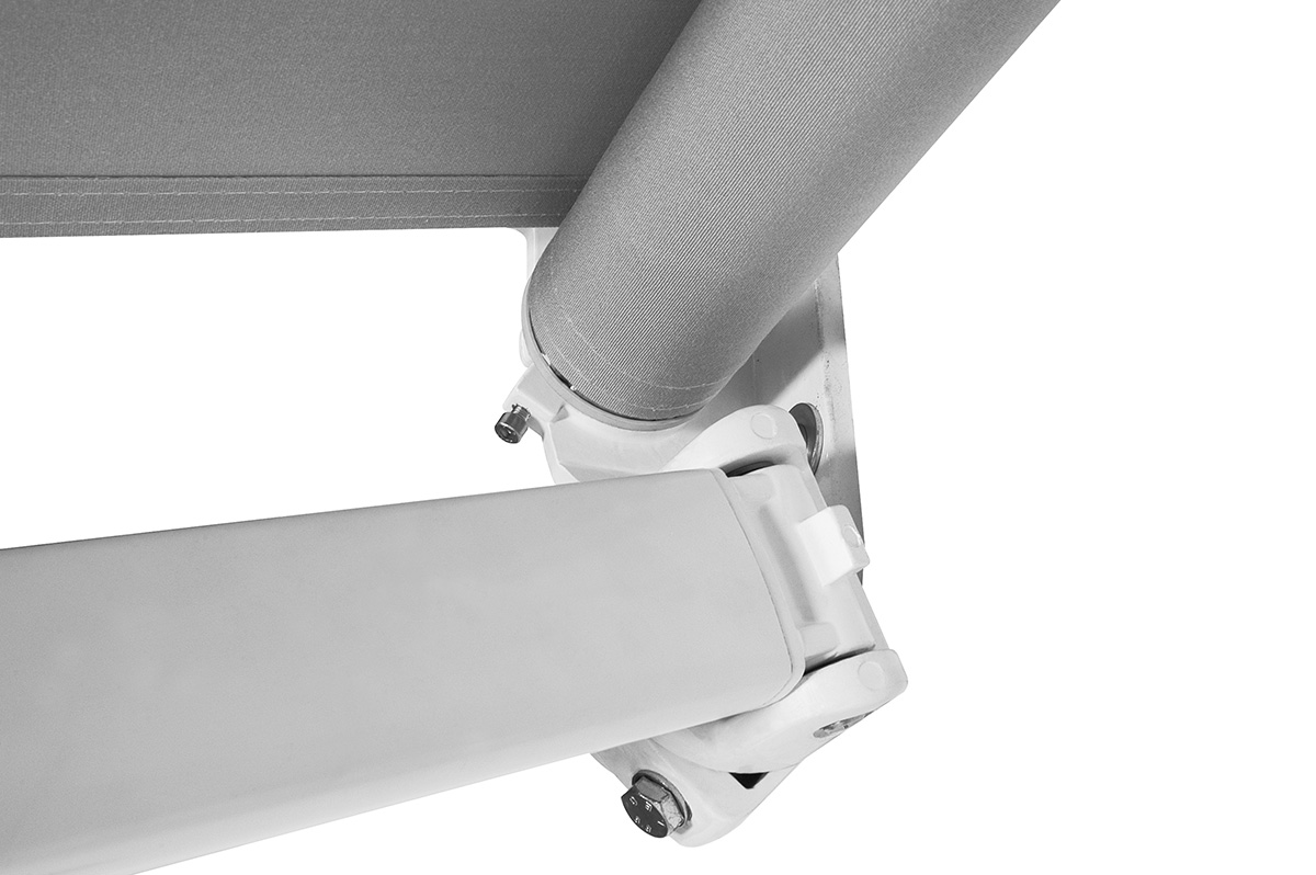 Folding arm awning on independent brackets with fixed lateral arm supports.Maximum dimensions: 600 cm width and 300 cm projection.