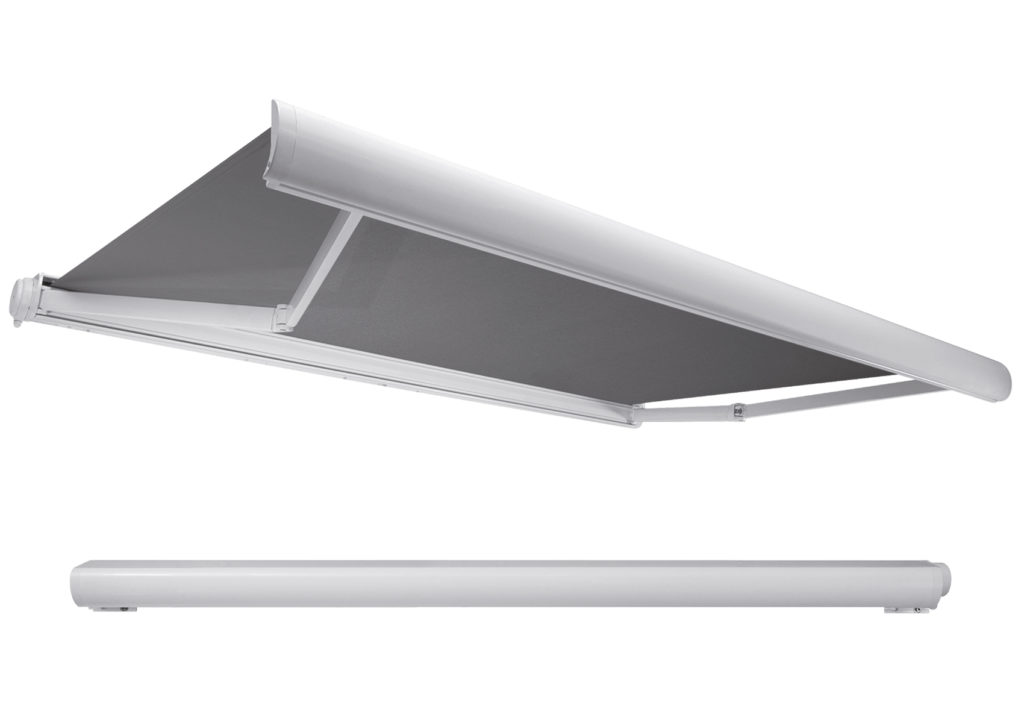 Folding arm awnings with cassette