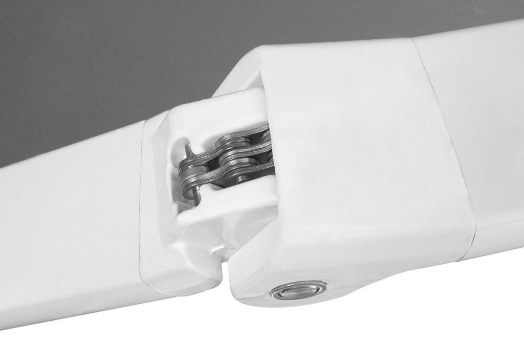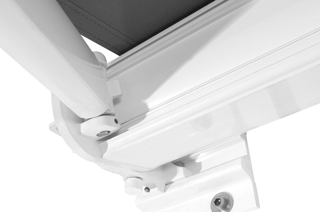 Folding arm awning with complete cassette on independent brackets with fixed lateral arm supports. Maximum dimensions: 600 cm width and 325 cm projection.