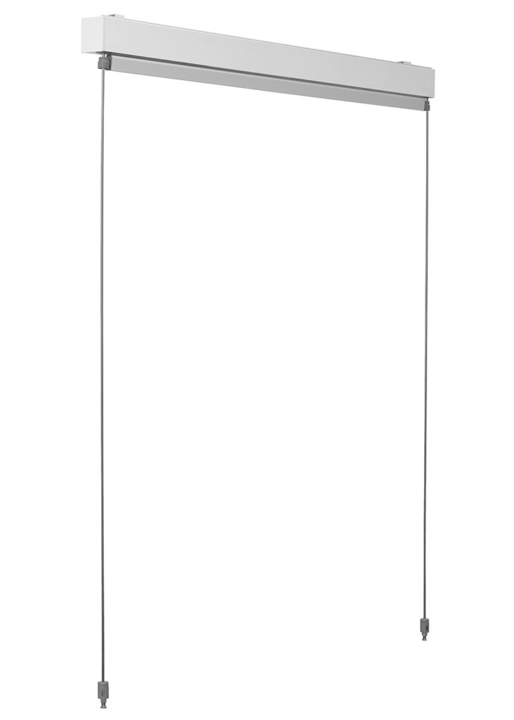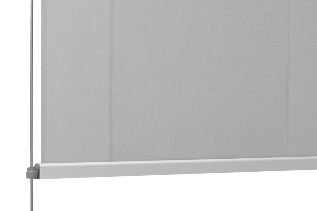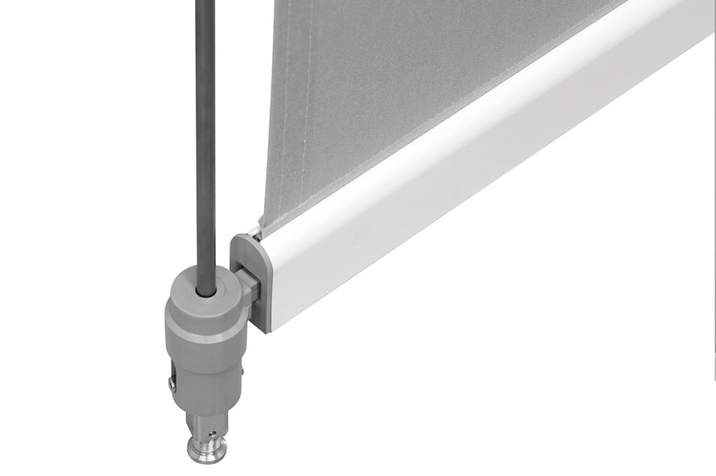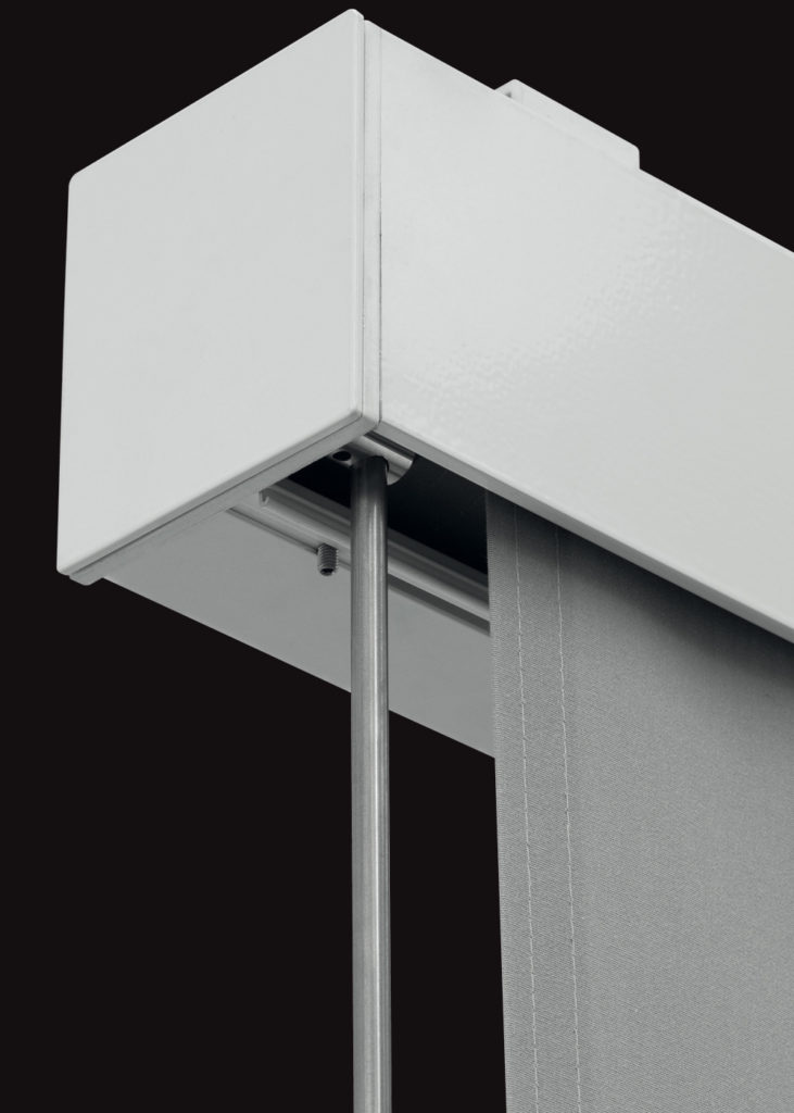 Store à descente verticale avec cassette de design carré e avec tige en inox de 10 mm d’épaisseur. Kit de fixation magnétique en option pour mettre sur le pied pour tendre le tissu. L’attraction des aimants est égale à 14 kg sur chaque pied.