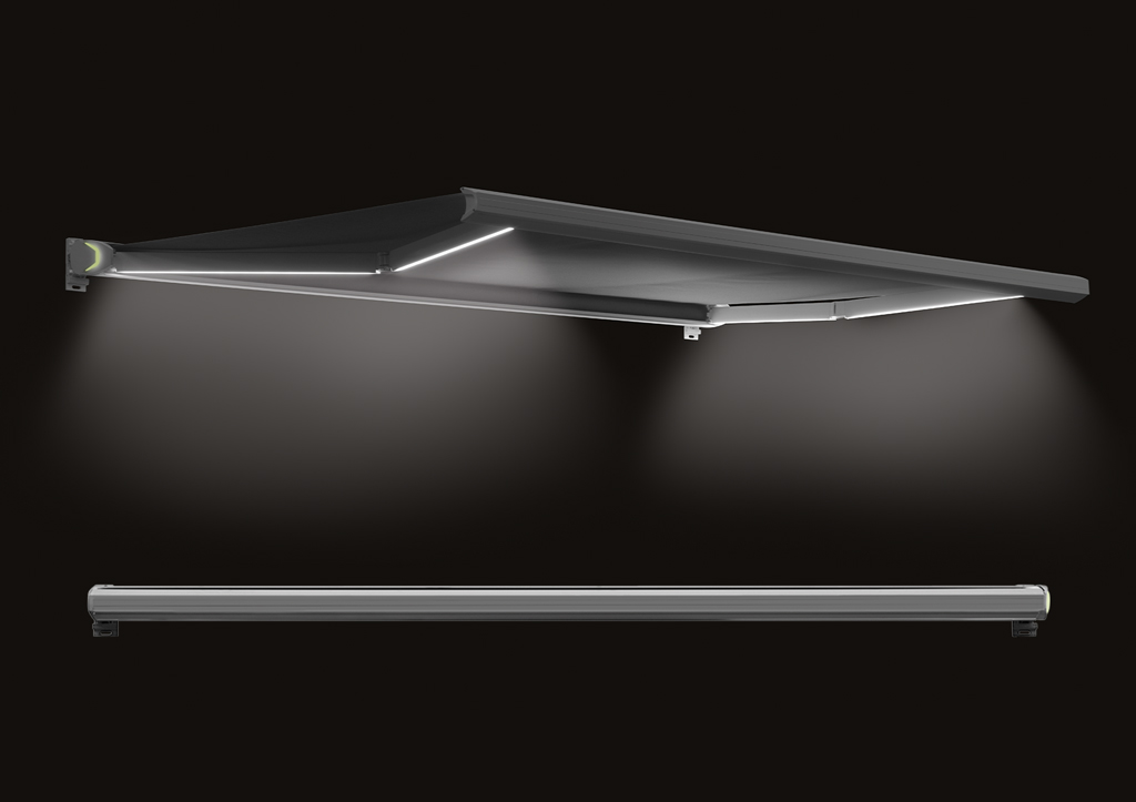 En plus de la tête latéral RGB, comme dans le modèle Special, la store montre l’installation de bras LED avec lumière blanche dimerabile pour éclairer l’espace extérieur dans la nuit. Les bras sont connectés à un transformateur doté d’une unité de commande dont le fi l d’entrée est distinct de celui du collecteur RVB. Ils peuvent être contrôlés indépendamment les uns des autres, soit par une télécommande, soit par une application spéciale sur le smartphone.
