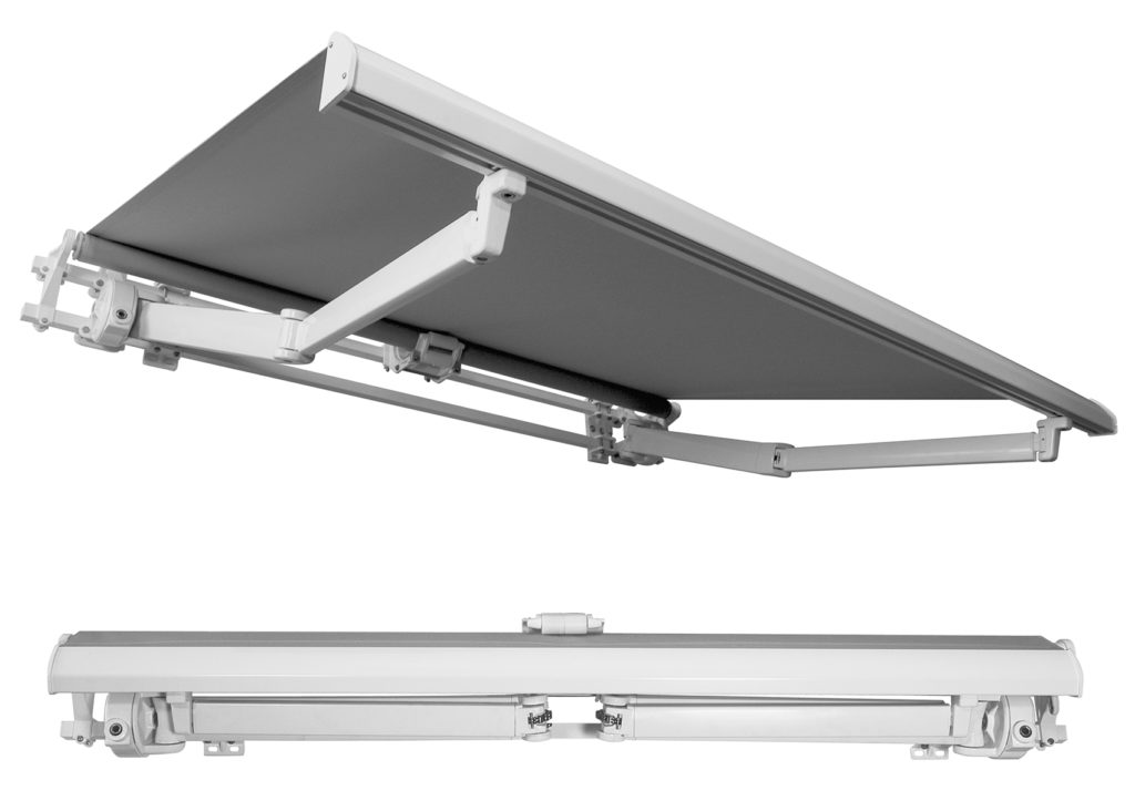 Store à bras sur double barre carrée 40×40 mm avec support bras à positionnement latéral et intermédiaire. Dimensions maximales du module simple: largeur 710 cm et avancée 550 cm.