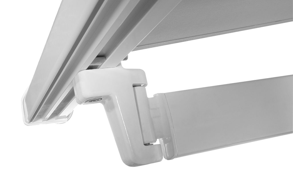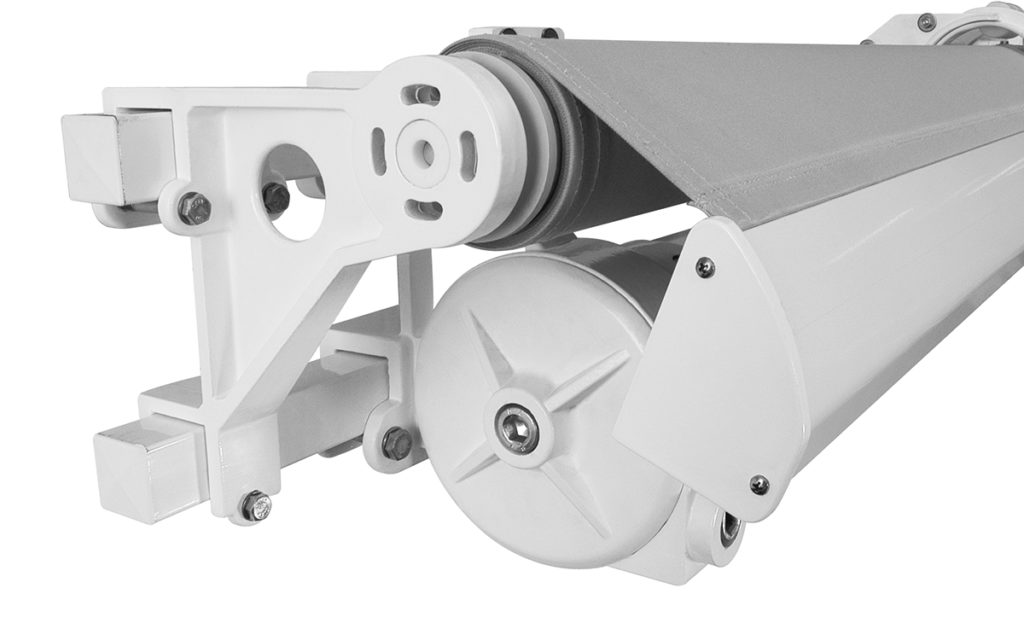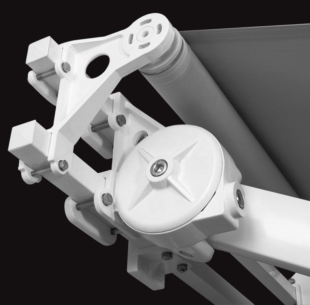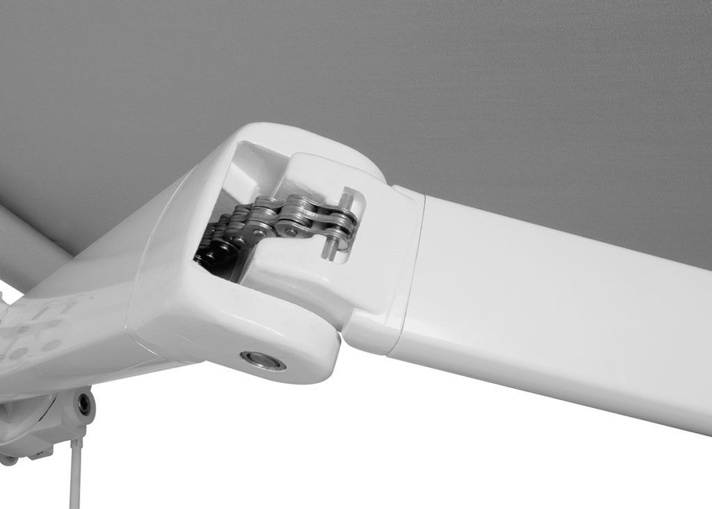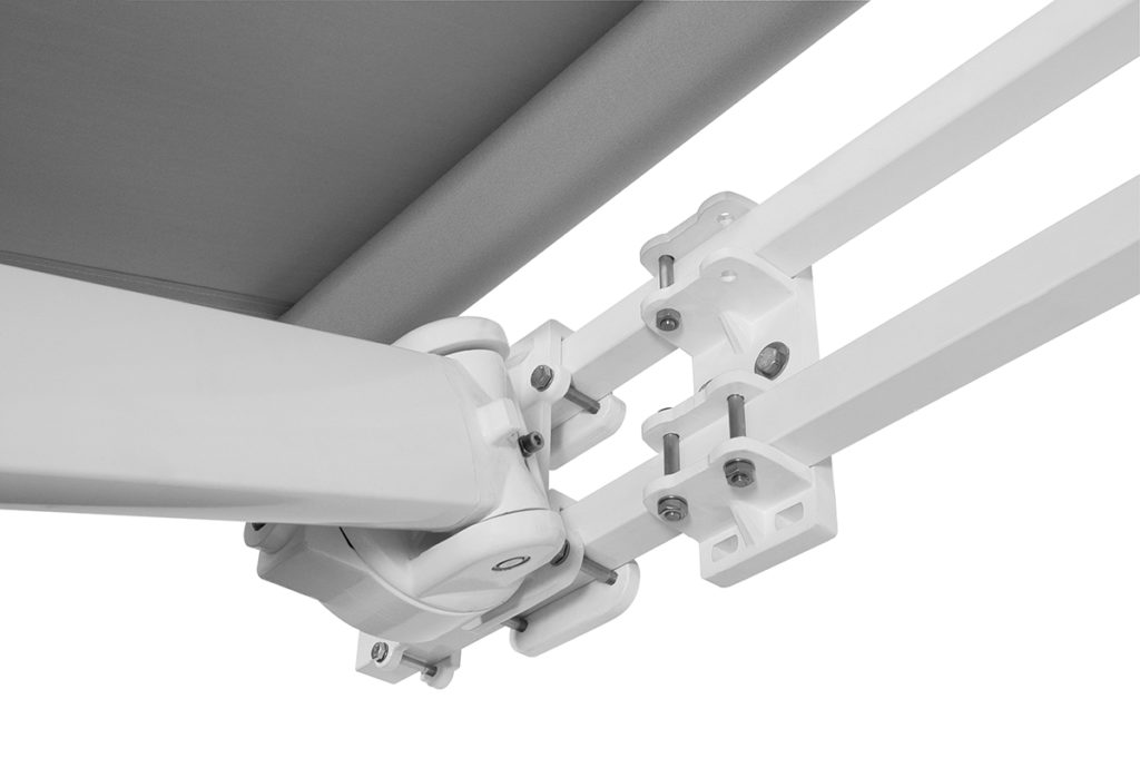 Store à bras sur double barre carrée 40×40 mm avec support bras à positionnement latéral et intermédiaire. Dimensions maximales du module simple: largeur 710 cm et avancée 550 cm.