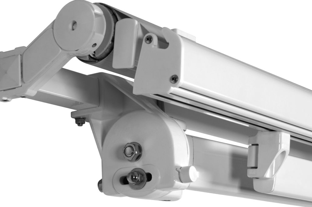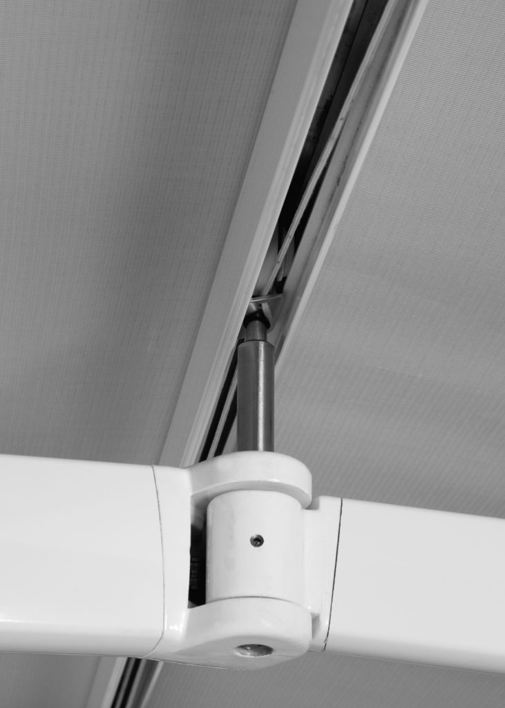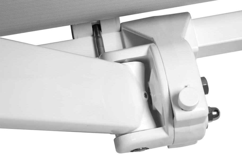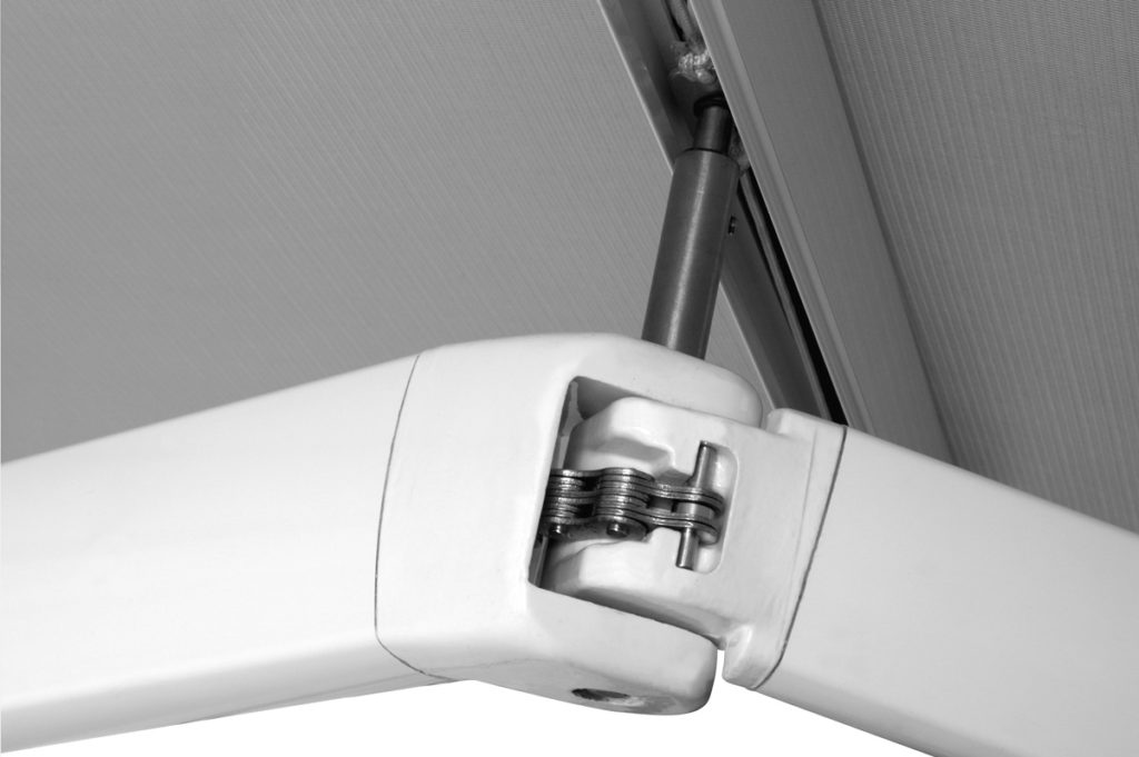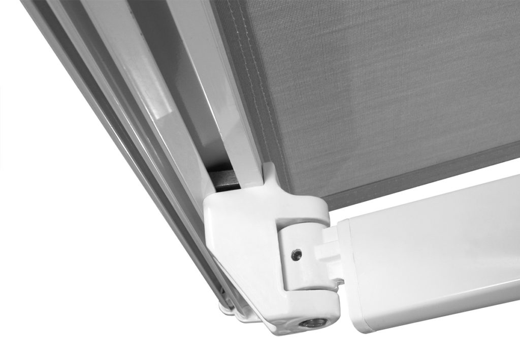 Store à bras sur barre carrée 40×40 mm avec support bras à positionnement latéral et intermédiaire. Avec bras inclinés à 170° degrés vers le bas et avec profil brise-vent central. Dimensions maximales du module simple: largeur 600 cm et avancée 425 cm.