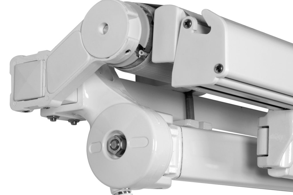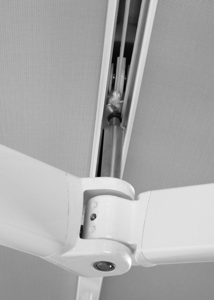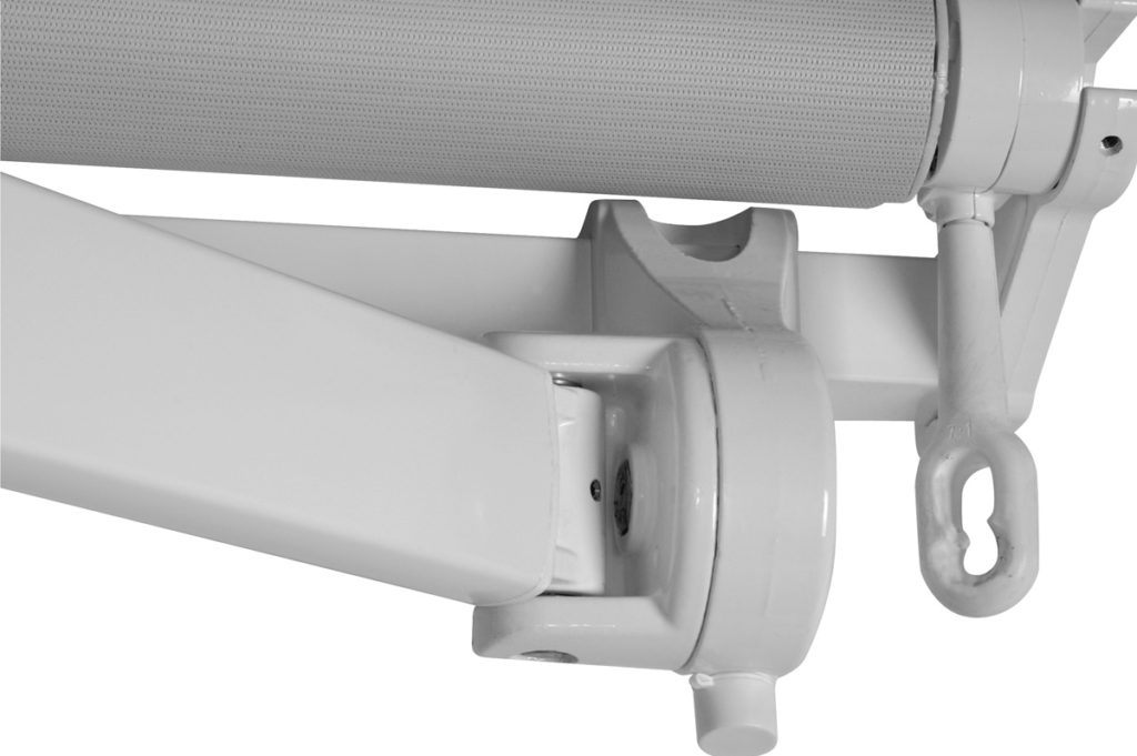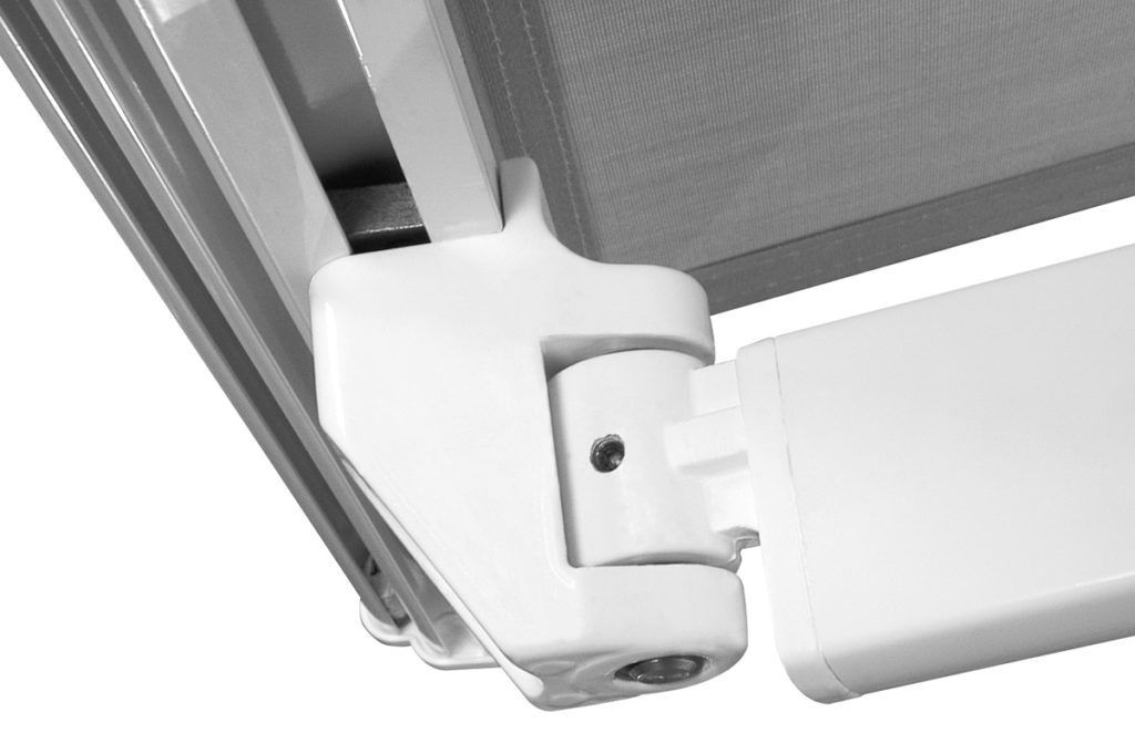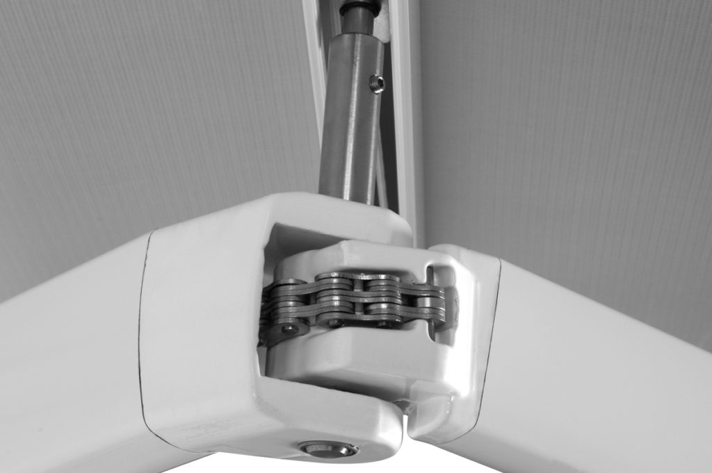 Tenda a bracci su barra quadra 40×40 mm con supporto braccio a posizionamento laterale e intermedio. Con bracci inclinati di 170° verso il basso e con profilo frangitratta centrale. Dimensioni massime modulo singolo: larghezza 600 cm e sporgenza 350 cm.