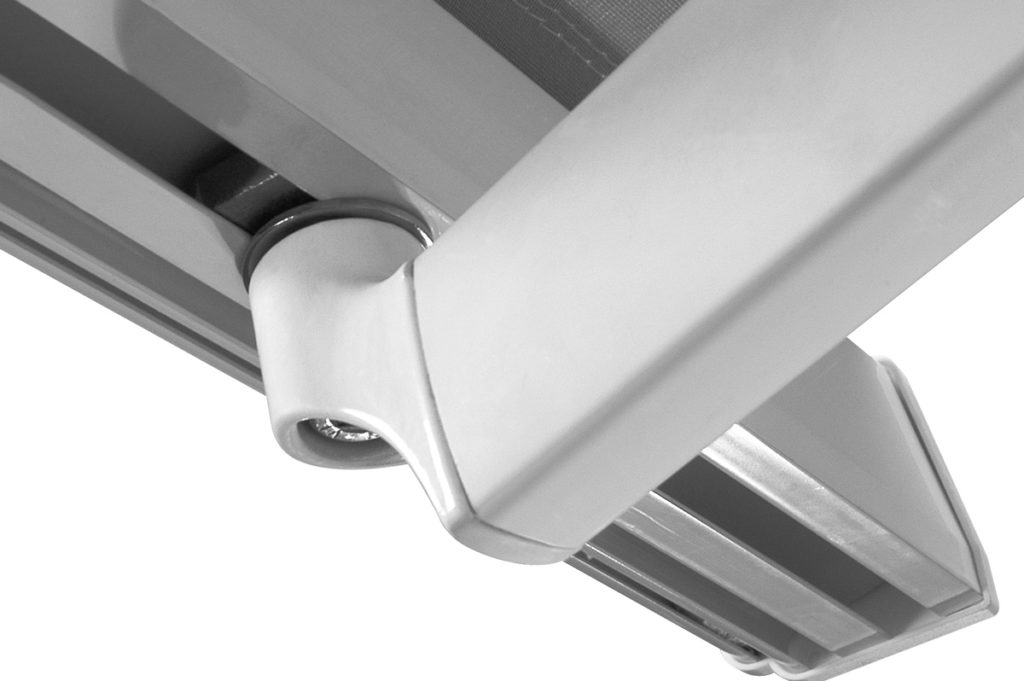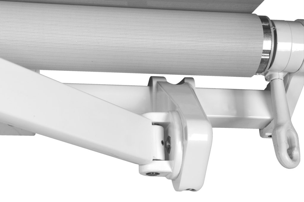 Tenda a bracci su barra quadra 40×40 mm con supporto braccio a posizionamento laterale e intermedio. Dimensioni massime modulo singolo: larghezza 600 cm e sporgenza 250 cm.